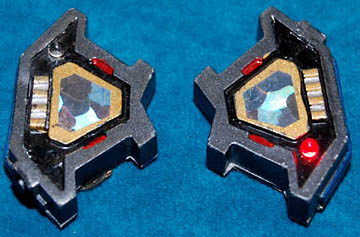 gunmetal gray with gold, red and black colored detail. A holographic application is in the center of each and there is a red LED light