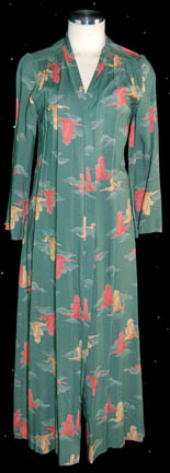 A costume item believed to have been worn by Nichelle Nichols and was found in the Star Trek feature films, “Uhura” section. The item is a long-sleeved, full-length green robe featuring multi-colored avian designs, further white accents and pleating around the shoulders.