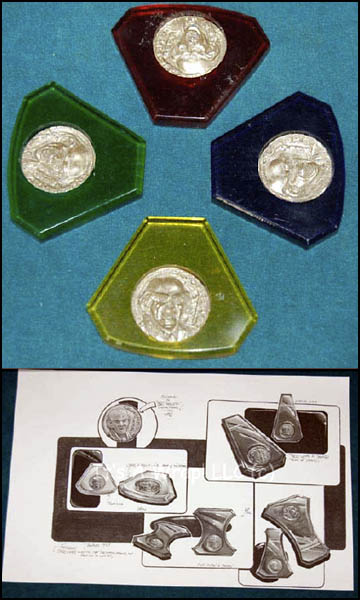 A lot of props featured in the Star Trek: Deep Space Nine episode “Waltz” and a set of concept drawings developed for the episode. The props are a set of “Quark’s” dabo chips, four triangular acrylic pieces with inset molded resin ‘coins’ featuring the smiling face of “Quark” (Armin Shimerman) and inscribed with his name in English as well as featuring an inscription in Ferengi. The chips are colored in translucent yellow, red, green, and blue; the inset coins are metallic silver.