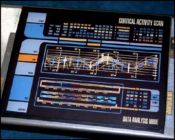 Retrieval System) style readout of static graphs, gages, and numeric values. The item is inscribed ‘Cortical Activity Scan and ‘Data