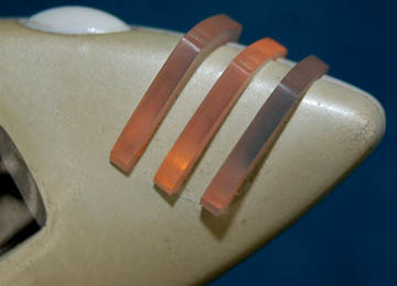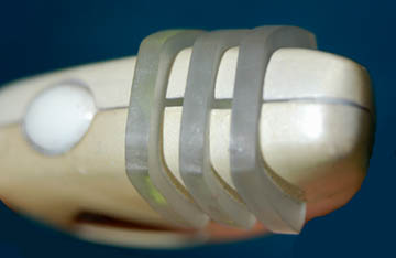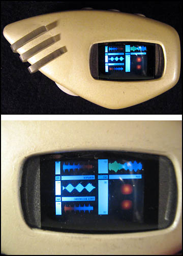 A prop item featured in the Star Trek: Voyager episode “Relativity”; wherein “Seven of Nine” (Jeri Ryan) is recruited, repeatedly, by “Captain Braxton” of the 29th century time ship “Relativity” to go back in time and prevent the destruction of “Voyager”. This item is the scanner that the “Ducane” (Jay Karnes) character waves over “Seven’s” ocular implant to make it disappear so she will not arouse suspicion in her mission; it has an irregularly, vaguely round, off-white, plastic housing featuring three white buttons on the top, a larger, white button on the bottom, and three, thin, clear accents on the front. The first two buttons cause red, orange, green and blue lights to alternate between the thee clear plastic pieces on the front, the big button on the bottom seems to be only for decorative purposes; there is a roughly rectangular “window” on the left side that, when the last button is pressed, lights up a display of different wavelength “scans”. Access to the working electronics is made via three screws on the left side of the item that still features battery power from production use. The item measures approx. 4 X 2 X 1 inches.