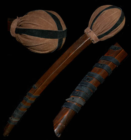 When “Worf” (Michael Dorn) and “Jadzia Dax” (Terry Farrell) were to wed in the Star Trek: Deep Space Nine episode “You are Cordially Invited”, the men invited to travel on the four day path of the “Kal'Hyah” were each presented with a Ma’Staka. They are pugil sticks used in Klingon weddings and are carried until the end of the ceremony where they are then used to attack the bride and groom. This Ma’Staka has a curved wooden handle painted brown with a black leather wrap attached to make the handle. The head is padded brown suede with black suede strips forming an ‘X’ on the top. Measures approx. 37 x 6 x 5 ½ inches.