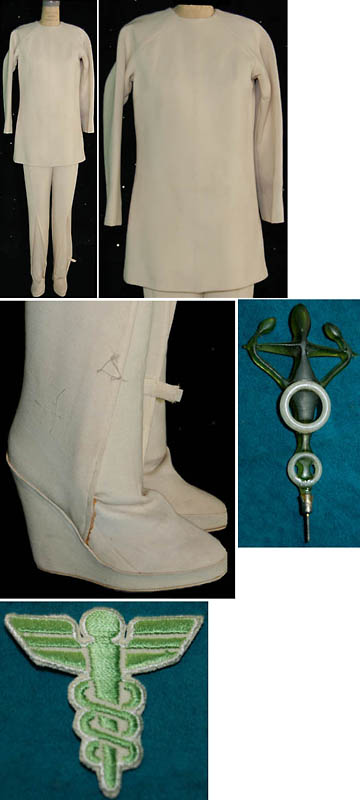 A Starfleet medical costume featured in Star Trek I: The Motion Picture through Star Trek VI: The Undiscovered Country. The costume is a set of off white trousers with attached shoes and a matching surgical smock. The uniform features these unattached elements: a white trimmed green banded medical division strip for the left sleeve appearing in Star Trek II: The Wrath of Khan and afterward, a green medical cadesus patch like those appearing in Star Trek I: The Motion Picture, a fragile resin and cadesus badge like those appearing in Star Trek II,and a pair of green division strips for the shoulders. The costume is intended for female wearers.