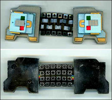 An impressive cast resin “synaptic scanner” used in various Star Trek episodes including Star Trek: The Next Generation, Deep Space Nine, and Voyager. The piece is painted metallic pewter with gold accents and faux green and red lights. Two bands of blue leather with gold thread join the two ends together. One like this was worn by “Quark” (Armin Shimerman) in the episode “Bar Association” while he was in the infirmary on Deep Space Nine. Powered by two 3v batteries. The red and green LED lights flash in alternating fashion. Measures approx. 5.25 X 1.25 X .25 inches.