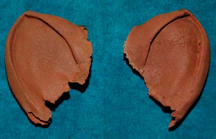 A pair of special effects applications like those appearing on Romulan and Vulcan characters in Star Trek episodic television and feature films. The items are made from molded foam rubber colored a nice dark chocolate brown. We can only speculate how long the items have existed but conventional suppositions point to their having been created for episodes of Star Trek: Enterprise.