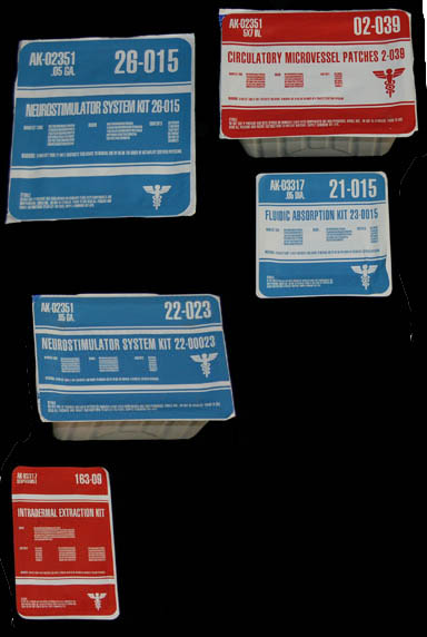 A lot of five medical supplies containers made for use on the Star Trek: Enterprise series. Each item contains actual medical supplies (not for use) with Starfleet medical labels applied on the top for detail. Three labels are blue, two are red and all feature the Starfleet medical logo. Largest piece measures approx. 7 ¼ x 8 ¼ x 2 ¼ inches.