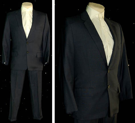 A costume featured in the Star Trek: Deep Space Nine episode “It’s Only a Paper Moon”; wherein “Nog” returns from battle with the Dominion after losing a leg and can’t seem to make sense of his life and retreats to the holographic environment of “Vic Fontaine” (James Darren). This costume is for wear by Aron Eisenberg in the role of the first Ferengi ever to be in Starfleet and the son of “Grand Nagus Rom” (Max Grodenchik), “Nog”, and is two long-sleeved, white, button-down, dress shirts, a long-sleeved, blue suit jacket featuring functional pockets, buttons down the front, a satin lining, and matching trousers. A costumer’s tag reads ‘DS9 560, Nog, Aron Eisenberg’