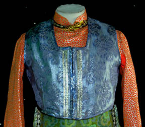 and silver patterned waistcoat with silver colored metal bars down the front either side of the Velcro fastening. An impressive