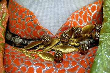 the right. The coat tapers down into a stylized triple knot at the bottom, ending with two tassels. Three beaded ribbon bands are on
