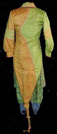 each sleeve and down the collar. Three gold colored jewelry pieces cover the snap fasters at the front. A matching Ferengi head