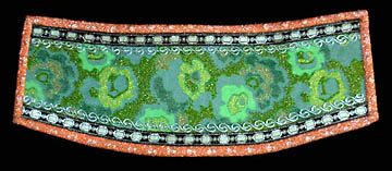 cropped coat is the final layer, made of orange and silver fabric with a green leaf motif on the left side and green on green fabric on