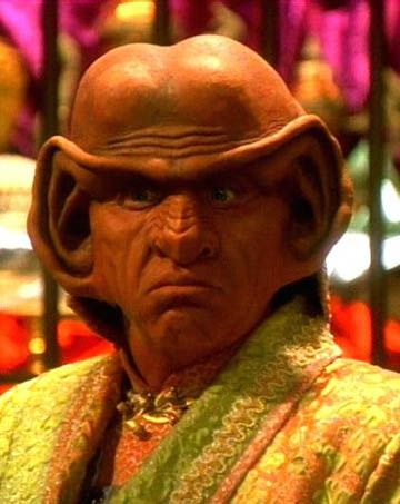 A magnificent Ferengi costume. “Kol” (Leslie Jordan) was a Ferengi shuttle pilot who was controlling the economy of a primitive world to gain obscene amounts of profit illegally with a second Ferengi in the Star Trek: Voyager episode “False Profits”. This costume was worn by his stunt double